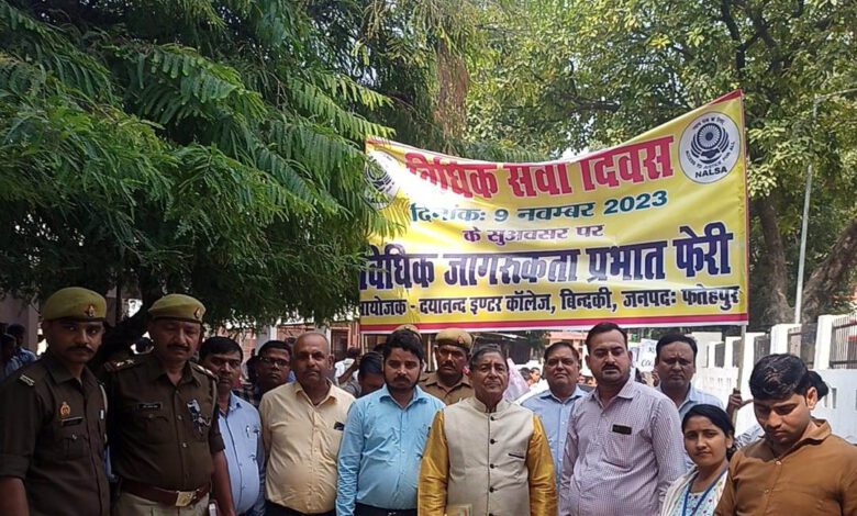 उक्त के अनुपालन में माननीय सदस्य सचिव महोदय एवं माननीय जनपद न्यायाधीश महोदय के निर्देशानुसार दिनांक-09.11.2023 को विधिक सेवा दिवस कार्यक्रम का आयोजन जनपद फतेहपुर, मुख्यालय, समस्त तहसील परिसर, समस्त ब्लाक, समस्त विद्यालयो एवं विधि महाविद्यालयो के स्तर पर, मुख्य चिकित्साधिकारी के स्तर से आशा बहुओ एवं आंगनबाड़ी कार्यकत्रियो के सहयोग से जनपद में दूरस्थ ग्रामीण अंचलो में प्रत्येक व्यक्ति को उनके विधिक अधिकारो एवं जनकल्याणकारी योजनाओ से जागरुक किया गया।