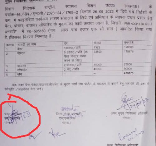 गोण्डा। राष्ट्रीय स्वास्थ्य मिशन अन्तर्गत फाइलेरिया कार्यक्रम अभियान के प्रचार प्रसार हेतु एफएमआर एडीसीपी 2.68 आईईसी-3 में 505160 रुपए जेम पोर्टल के माध्यम से टेंडर कराए जाने हेतु आवंटित किया गया जबकि स्वास्थ्य विभाग के संबंधितों द्वारा नियम कानून कायदे को दरकिनार करते हुए पत्रांक संख्या-56 दिनाँक-24.7.2023 को बगैर सीएमओ का हस्ताक्षर कराए ही 479175 रुपए की नोट शीट बनाया गया और उसके बाद दिनाँक 27.7.23 को सीएमओ डॉ0 रश्मि वर्मा का हस्ताक्षर व पटल सहायक के मुहर पर एनएमए विनोद गुप्ता का हस्ताक्षर युक्त नोट शीट 484635 रुपए का बनाकर बगैर जेम पोर्टल के माध्यम से टेंडर कराए ही मनमानी तरीके सेबैनर,पोस्टर,बाउचर,लीफलेट मुद्रण आदि कार्य हेतु एल-1 करके मनचाहे ठेकेदार को कार्य दे दिया गया।